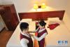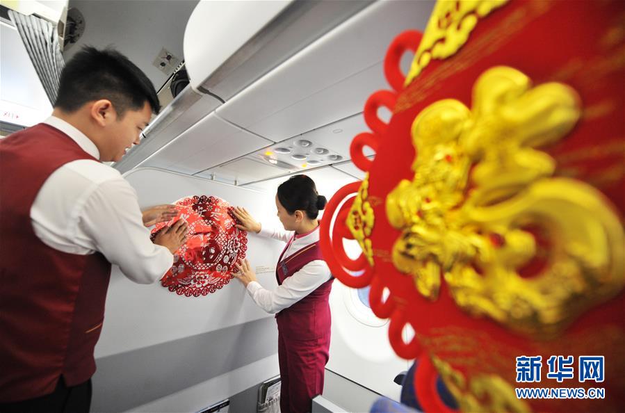 2月1日,寧儒(左)和梁鶴在旅客登機前裝飾客艙,讓旅客提前感受過年的喜慶氛圍。新華社發(楚洪雨 攝) -