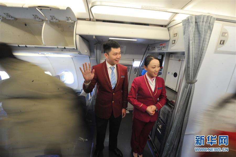 2月1日,寧儒和梁鶴在航班上為乘客服務。新華社發(楚洪雨 攝) -