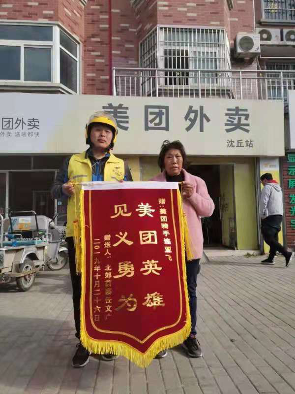10月26日,河南省周口市沈丘縣美團(tuán)外賣配送中心站的90后騎手連亞飛,在送餐途中路過沈丘蔡河橋西邊時,發(fā)現(xiàn)一騎三輪車婦女突然失控,大人小孩連人帶車一起掉到河里,他奮不顧身跳入河中救起2人。救人的事跡傳開后,連亞飛成了方圓數(shù)里的“紅人”,10月28日,共青團(tuán)沈丘縣委授予他“見義勇為好青年”榮譽(yù)稱號,美團(tuán)外賣平臺授予他“模范騎手”榮譽(yù)稱號和800元現(xiàn)金獎勵。