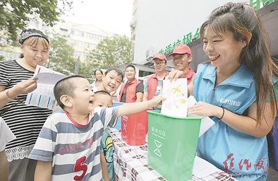 圖② 8月31日,團(tuán)市委在解放區(qū)焦西街道祥和社區(qū)月季茗苑小區(qū)開展“黨群聯(lián)心院”授牌儀式暨支部黨員志愿服務(wù)進(jìn)社區(qū)活動,志愿者在教小朋友進(jìn)行垃圾分類。