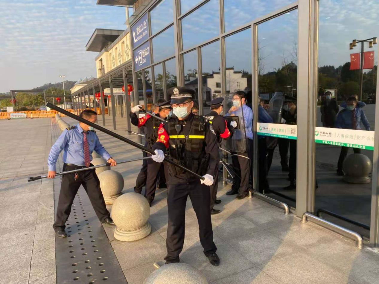 為確保火車站區(qū)域絕對(duì)安全,進(jìn)一步提升民警和鐵路職工現(xiàn)場(chǎng)處置應(yīng)急實(shí)戰(zhàn)能力。18日上午,婺源車站派出所聯(lián)合婺源站、站前管委會(huì)等人員在婺源站舉行了模擬警情應(yīng)急處突演練。