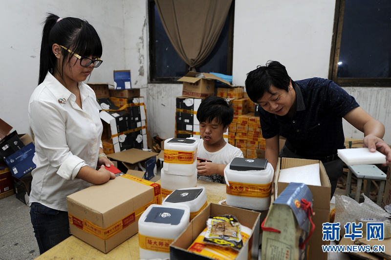 9月16日,來自河南周口的周夢雪(左)與來自紹興的朱健愷(中)、夏建慶(右)在倉庫內打包黃酒,他們三個都是殘疾人。周夢雪是2013年在這里參加培訓并且留了下來,朱健愷是這里的培訓老師,平時也在店里工作,而夏建慶也有自己的一家淘寶店。