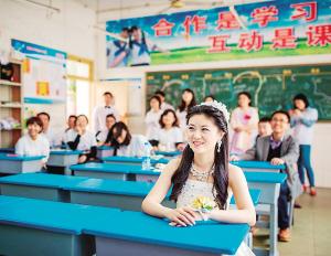 溫婉秀美的新娘坐在前排,不時抬頭冥想。新郎則坐在后排,悄悄地關注著“女神”的一舉一動。新郎親吻了新娘,圍觀的“同學們”起哄叫好聲一片,“現在把以前上學的遺憾補起。”