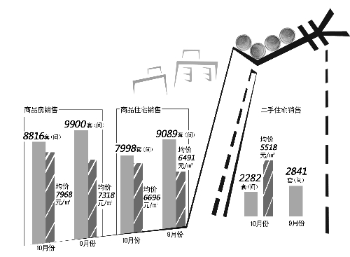 商住房均價6696元/平方米,較9月份漲了205元 二者銷量均較上月少賣1000多套
