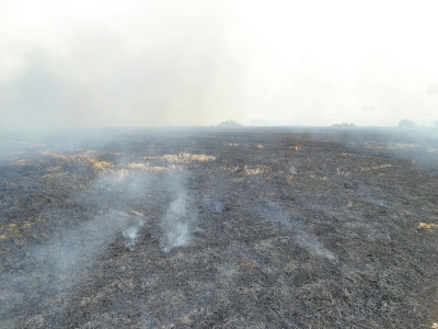 一個多小時后,本報記者趕到現場,見到京港澳高速公路淮河大橋北岸的路東側麥茬地里,因過火已出現大片的“黑地圖”。沒過火的地塊里,村民們正在用木桿鐵叉,抖撒收割機收割粉碎還田的秸稈,使其蓬松在麥茬上以便燃燒;遠處幾塊麥茬地的地頭處,幾名村民還在不停地放火。