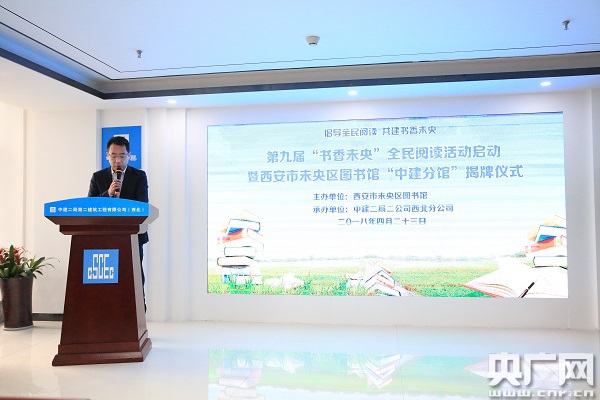 央廣網河南分網4月24日消息 為了深入貫徹落實“十九大”精神,落實西安“促進全民閱讀,打造書香之城”的安排部署,助力建設“書香未央”,打造書香中建企業文化。4月23日,第九屆“書香未央”全民閱讀活動啟動暨西安市未央區圖書館“中建”分館揭牌儀式在中建二局二公司西北分公司總部舉行。