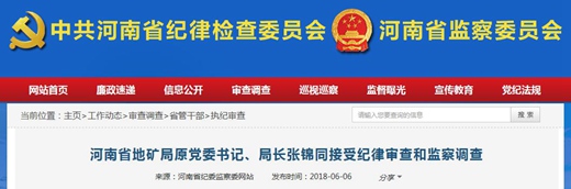 央廣網河南分網消息 (侯琳琳)記者從河南省紀委監察委網站獲悉:河南省地質礦產勘查開發局原黨委書記、局長張錦同涉嫌嚴重違紀違法,目前正接受河南省紀委監委紀律審查和監察調查。