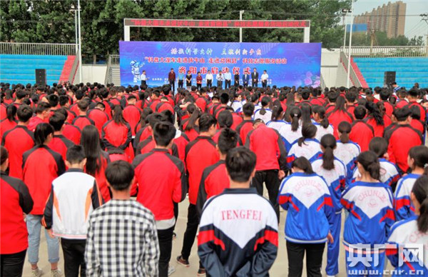 愛心單位捐贈了價值33萬元的機器人工作室器材設備、圖四授旗儀式(央廣網發 通訊員 王紅松供圖)