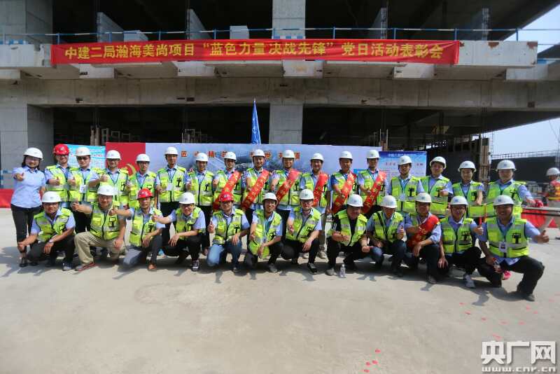 央廣網河南分網消息 七月十日上午,頂著夏日驕陽,冒著嚴冬風雪,瀚海美尚項目迎來了建設的階段性勝利——匠心精筑、耀世封頂;項目黨支部借著喜封金頂這個大好時機,開展了“藍色力量 決戰先鋒”表彰會,中原分公司生產副總吳小志、項目經理鄭利及全體管理人員、勞務公司、甲方監理共同參加。