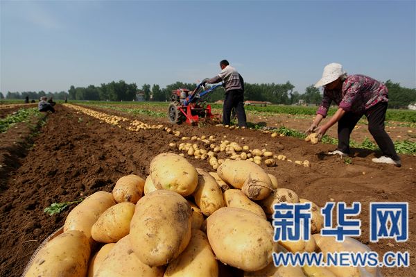 央廣網河南分網消息 據新華網河南頻道報道:5月6日,商水縣城關鄉瓦房店村“農超對接”蔬菜基地的200余畝土豆開始采收,80萬斤土豆將按市場需求逐批收獲上市。該基地采用三層薄膜覆蓋、有機蔬菜管理模式栽培種植,上市早、口感好,每畝收入可達7000余元,成為拉動當地農民致富的“金蛋蛋”。
