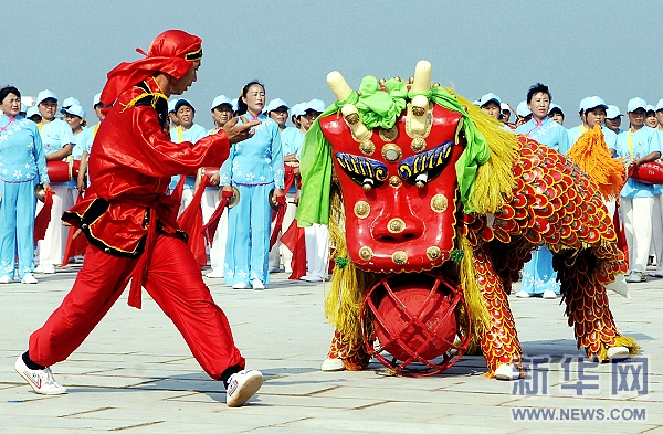 來自河南省睢縣的一支民間社火隊在表演“麒麟舞”。“麒麟舞”已被列入國家級非物質文化遺產名錄(2007年3月18日攝)。