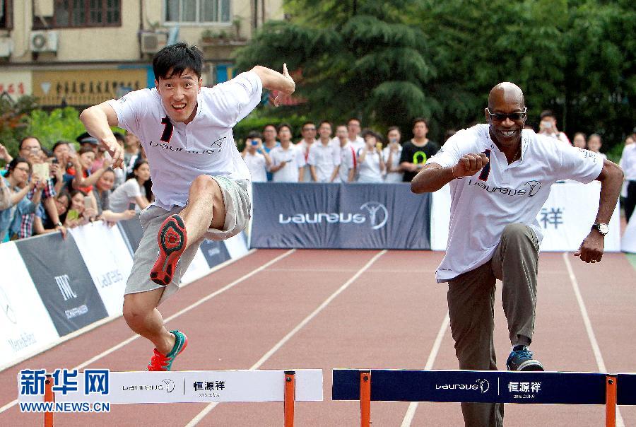 6月9日,劉翔(左)和摩西在進(jìn)行跨欄表演。當(dāng)日,劉翔和勞倫斯世界體育學(xué)會(huì)主席愛(ài)德溫·摩西一起來(lái)到上海格致中學(xué)和中學(xué)生上體育課,并傳授跨欄技藝。 (新華社記者凡軍攝)