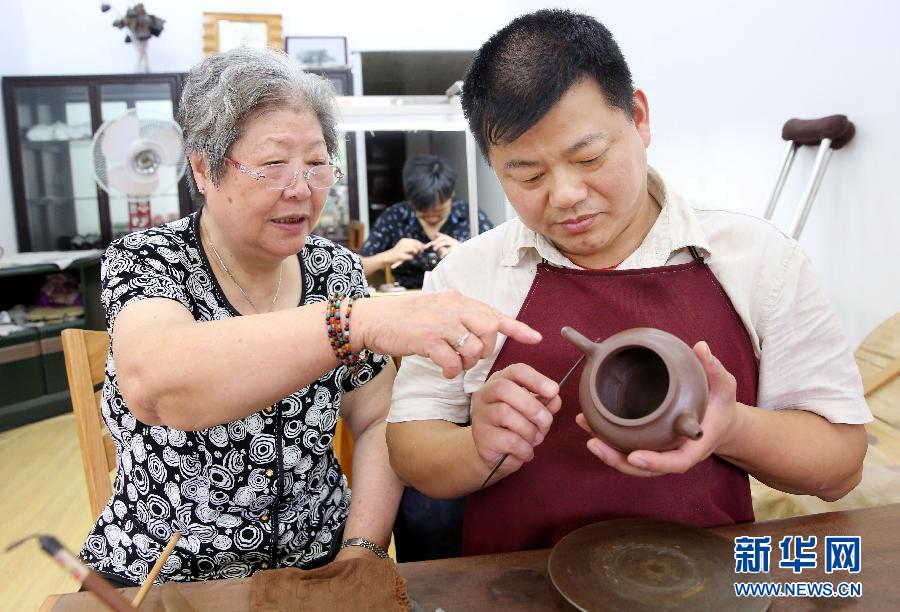6月23日,在江蘇宜興紫砂陶藝名家曹婉芬的工作室,曹婉芬(左)在指導(dǎo)身有殘疾的“徒弟”唐國(guó)忠制作紫砂壺。