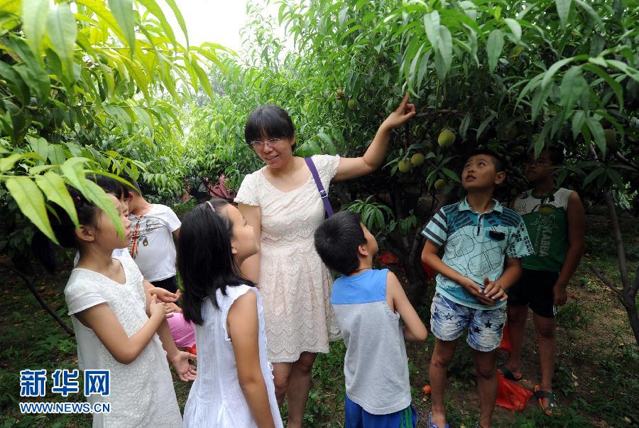 7月17日,在河北廊坊廣陽區南尖塔鎮果園中,家長在給孩子們講授桃樹的相關知識。