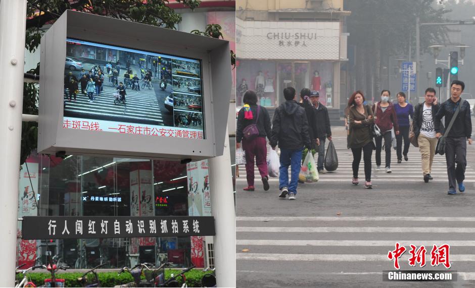 10月9日,河北石家莊行人闖紅燈抓拍“神器”,嚴密地“監督”著通過斑馬線的市民們。該“神器”為行人闖紅燈自動識別抓拍系統,如果行人信號燈為紅燈時,仍有市民通過斑馬線,系統會自動將其人圖像拍攝并形成照片到電子屏幕上。據了解,這在華北地區尚屬首家。圖為行人闖紅燈抓拍“神器”,行人違章將被曝光。中新社發 翟羽佳 攝