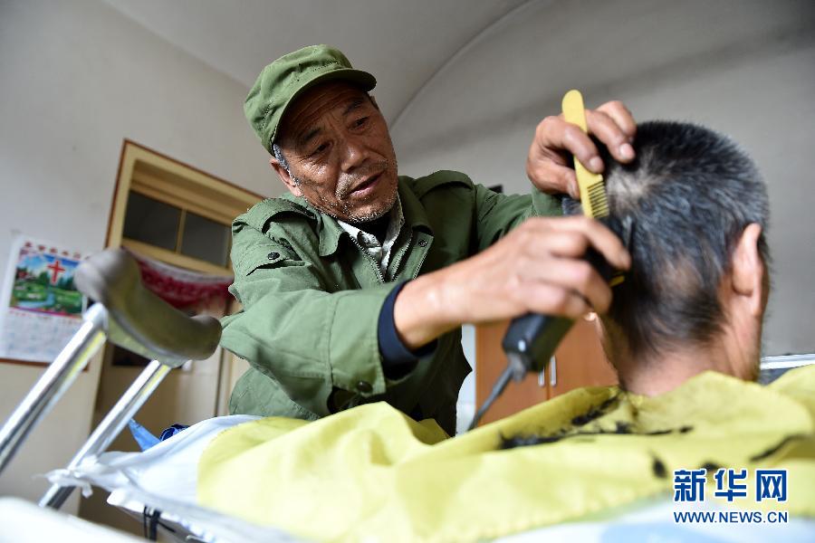 央廣網河南分網消息 據新華網報道:11月3日,李來生在為一位村民理發。今年63歲的李來生是山西省孝義市東莊村人,自1975年退伍后,每天堅持為村里的孤寡老人、行動不便的村民免費理發,雖然1980年他因病失去一條腿,但30多年來,李來生的義務理發從未間斷。 20世紀70年代,李來生在部隊當兵,見老兵去敬老院為老人義務理發,便萌生學理發念頭。一位老兵對李來生說,教你可以,但你學會了還要堅持為老人義務理發。李來生當時就做了一個承諾:一定堅持為有需要的人義務理發。此后的日子里,李來生用行動恪守著自己的承諾。“鄉里鄉親的,上門為他們理發,也能和他們聊聊天! 李來生說:“只要我還能走,我就會堅持做下去! 日前,李來生被山西省孝義市評為“孝義好人”。 新華社記者 詹彥攝