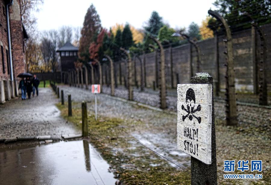 這是奧斯威辛集中營內用德語和波蘭語寫的“止步”標示(2014年11月8日攝)。 新華社記者金良快攝