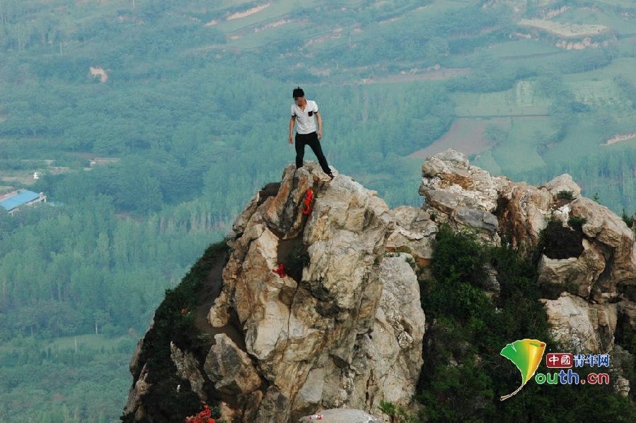 央廣網河南分網消息 2015年05月03日,河南省鄭州市,“五一”小長假期間,新鄭軒轅故里始祖山上游客爆滿,幾名年輕人爬上幾百米高懸崖絕壁上拍照留影,更有家長帶著自己孩子玩起了驚險動作。