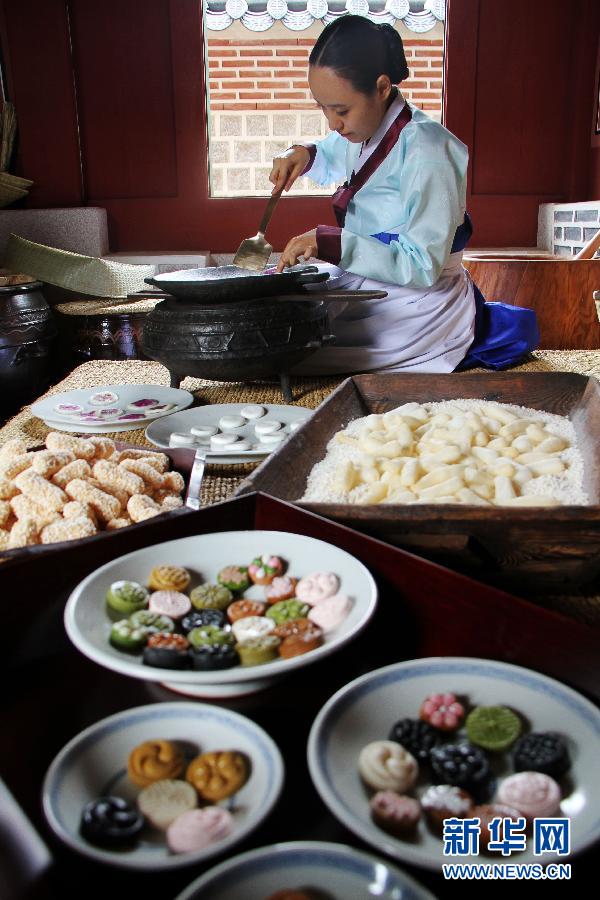 5月2日,在韓國首爾景福宮御膳房,一名演員扮演的“宮女”制作宮廷傳統糕點。