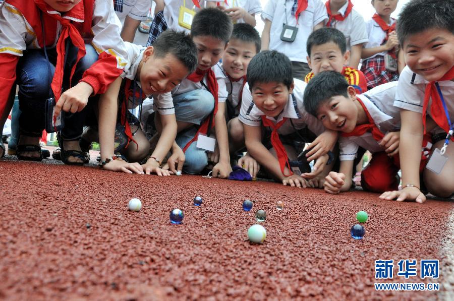 江西省萬載縣第一小學學生在玩“打彈珠”(5月27日攝)。