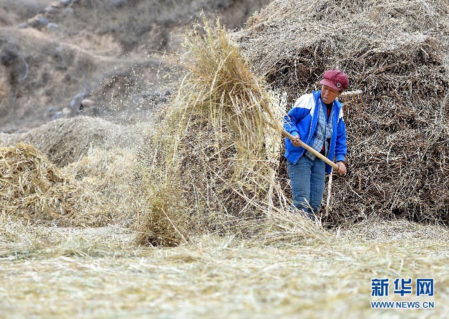 11月3日,和林格爾縣黑老夭鄉昆都侖村一名村民在打場碾壓莜麥。