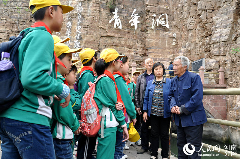 當(dāng)年修筑紅旗渠的勞模在向小學(xué)生講解