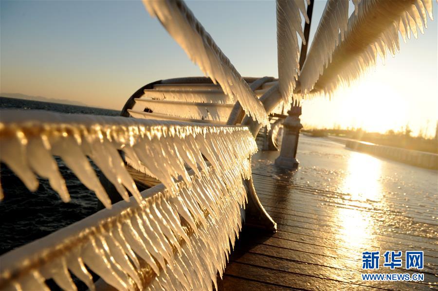 12月27日,大連東港沿海護欄冰凌凝結(jié),在朝霞的映照下十分美麗。新華社發(fā)(呂文正 攝)