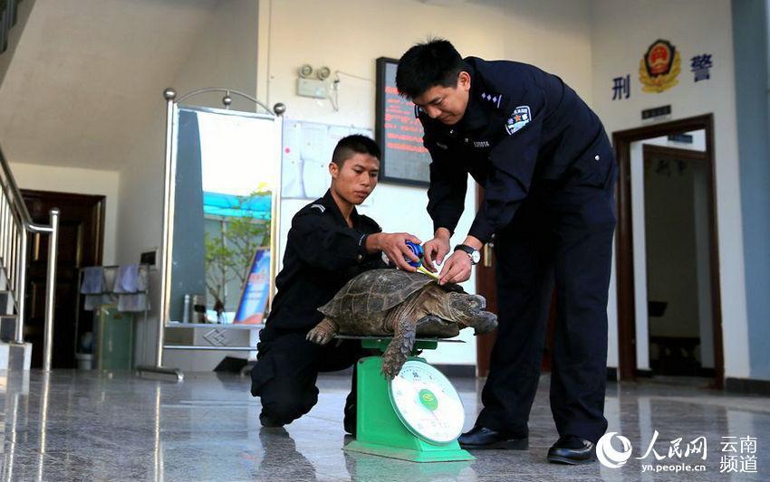 當日上午9點,勐海縣森林公安局民警接到群眾報案稱:“該縣一茶廠內(nèi)有人非法飼養(yǎng)國家重點保護動物凹甲陸龜。常宗波 攝 圖片來源:人民網(wǎng)
