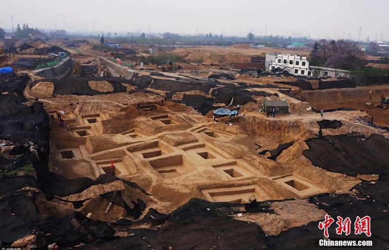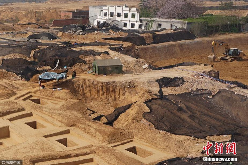 • 2017年4月14日,鄭州市一處叫常莊的拆遷城中村上,施工人員在村民民房下發現一片春秋戰國時期的古墓群,目前正在進行發掘中。 圖片來源:視覺中國