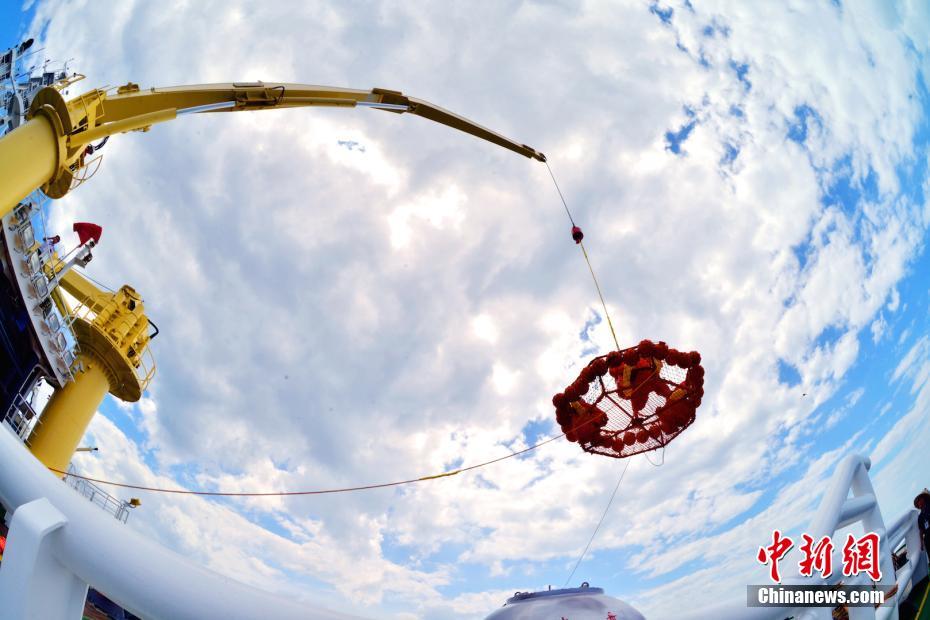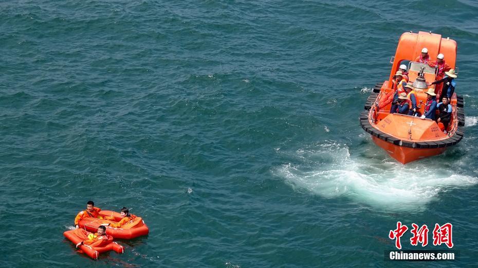 16名中國(guó)航天員和2名歐洲航天員,8月21日在山東省煙臺(tái)市附近海域圓滿完成了為期17天的海上救生訓(xùn)練任務(wù)。圖為訓(xùn)練期間,8月2日,甲板上的機(jī)械吊臂把救生吊籃起吊入水。 中新社發(fā) 朱九通 攝