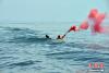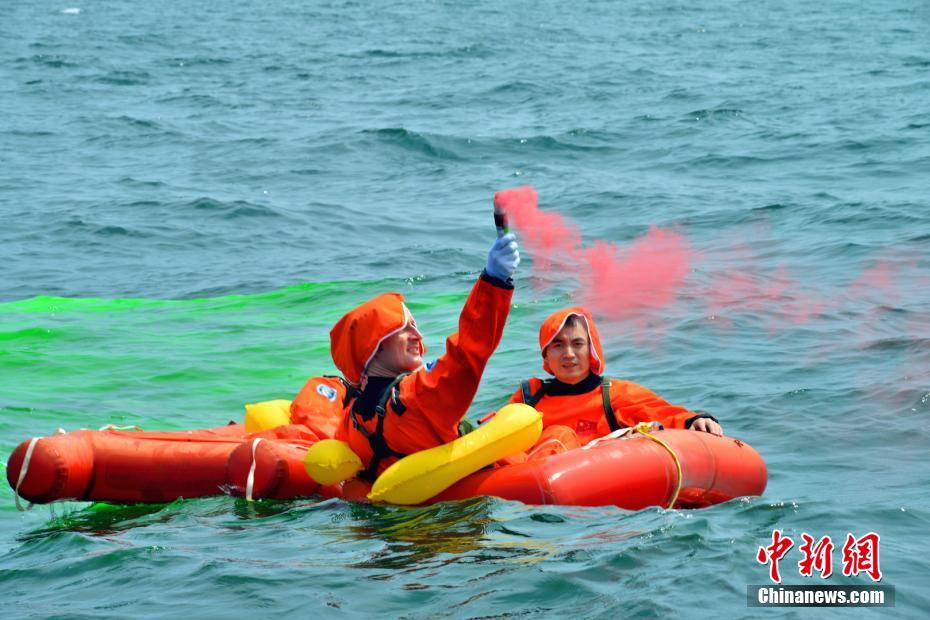 16名中國(guó)航天員和2名歐洲航天員,8月21日在山東省煙臺(tái)市附近海域圓滿完成了為期17天的海上救生訓(xùn)練任務(wù)。圖為訓(xùn)練期間,8月8日,參加訓(xùn)練的航天員在水上使用光煙信號(hào)管。 中新社發(fā) 朱九通 攝 -