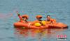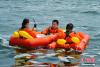 16名中國(guó)航天員和2名歐洲航天員,8月21日在山東省煙臺(tái)市附近海域圓滿完成了為期17天的海上救生訓(xùn)練任務(wù)。圖為訓(xùn)練期間,8月8日,受試人員坐在小艇上等待救援。 中新社發(fā) 朱九通 攝 -