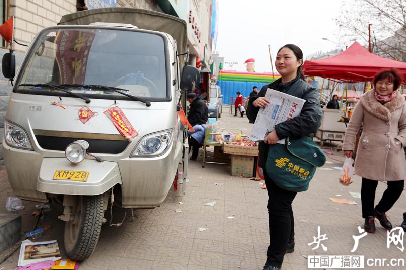 央廣網(wǎng)河南分網(wǎng)消息 2014年2月27日,農(nóng)歷馬年正月二十八,豫北河南滑縣道口鎮(zhèn)傳統(tǒng)火神廟會(huì)第二天,位于縣城中心腹地的紅旗路段人頭攢動(dòng),熱鬧非凡,滑縣郵政局投遞員肩挎郵包,拎著分好的報(bào)刊和郵件,步履維艱,穿行在數(shù)以萬計(jì)的古廟會(huì)人流中,上門為沿街商戶、轄區(qū)居民,挨家挨戶為群眾投送報(bào)刊和郵件,用真情和汗水詮釋著愛崗與敬業(yè)。