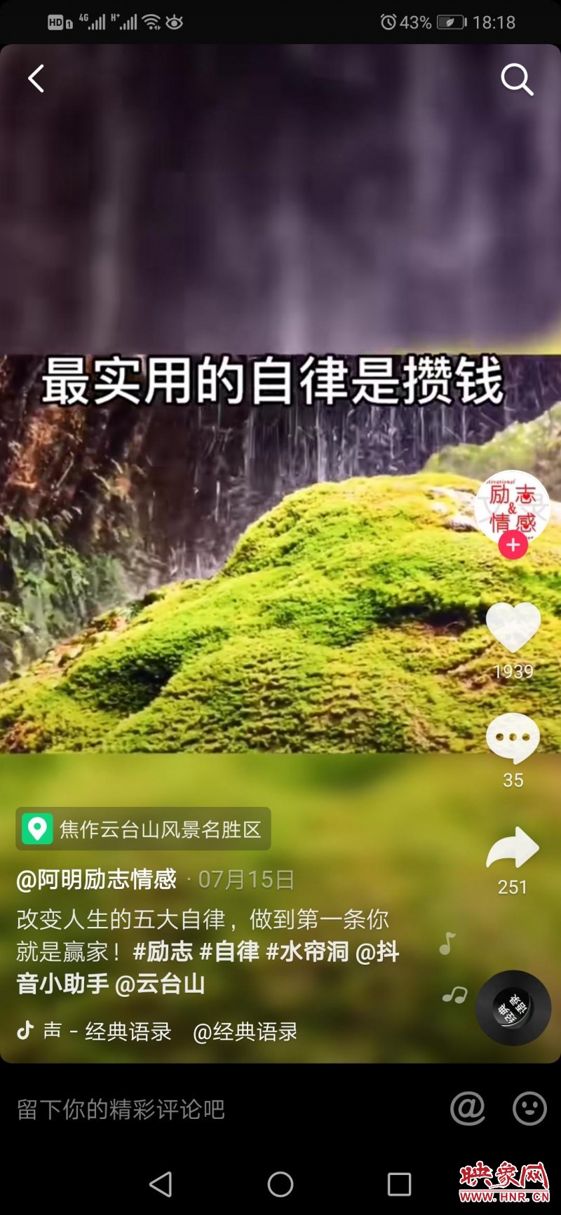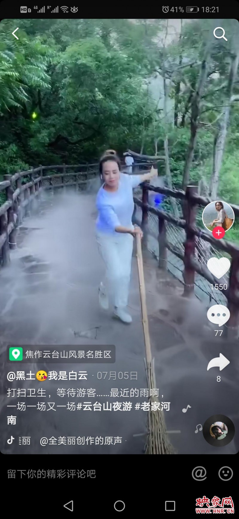 “有一次刷抖音,看到一個小姐姐在大山里配合音樂唱歌,感覺到是那么美,我就模仿這個視頻拍了一個抖音,當(dāng)時的燈光、天氣特別美,發(fā)出來以后一下就火了。”郭白云說,“我工作的云臺山特別美,我就開始把歌曲和美景結(jié)合起來,推出一系列短視頻。”