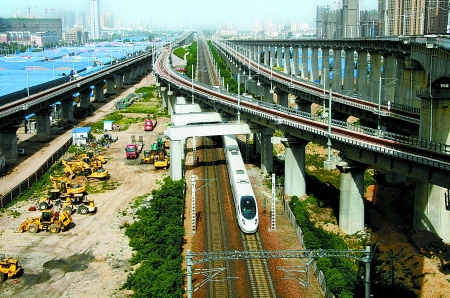 中廣網河南分網消息 據河南日報報道:5月21日,一列由鄭州開往上海方向的動車從隴海鐵路線上駛過,在其上方,是剛剛建成的石武客專鄭州東聯絡線。隨著石武客專主體工程的完工,由石武客專連接老鄭州東站的聯絡線在鄭州東形成了五線并聯、三層立體交叉的壯觀景象。 孫繼平 攝