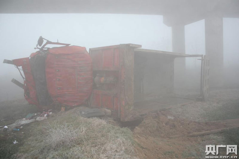 7時46分,消防官兵到達救援現場后發現,一輛貨車側翻在高架橋路下的深溝里,駕駛室被橋底的石柱穿過,被困司機生死未卜。交警已將現場封鎖,120醫務人員也在現場待命。經現場偵查,一名中年男子被卡在駕駛室,醫務人員已經對其進行止血。根據現場情況,消防指揮員迅速確定救援方案,對嚴重變形的駕駛室進行破拆。消防官兵手持液壓擴張器變形的駕駛室進行擴張,擴大了救援空間。最終,在現場救援人員的共同努力下,被困人員于7時57分成功獲救,被送上救護車前往醫院救治。由于清晨正值大霧、霜降,地面濕滑前方能見度不足50米,此時貨車車速較快,在看見橋面時已經來不及剎車,導致貨車沖出橋面,釀成本次事故的發生。