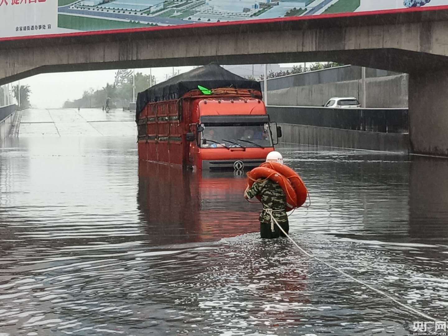 當日上午9時許,消防部門接到一起報警,一輛大貨車在經(jīng)過襄陽市余家湖南環(huán)路工業(yè)區(qū)一處涵洞時,導致車輛涉水熄火,包括駕駛員在內(nèi)的兩人被困水中。