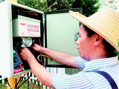 圖為:李中華檢查氣象區(qū)域自動(dòng)站電壓情況 楚天都市報(bào)記者陳希攝