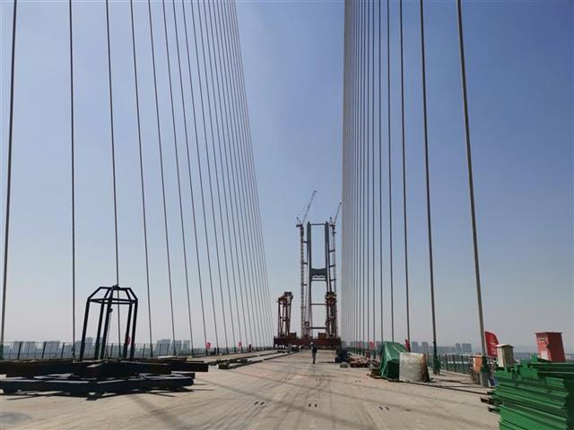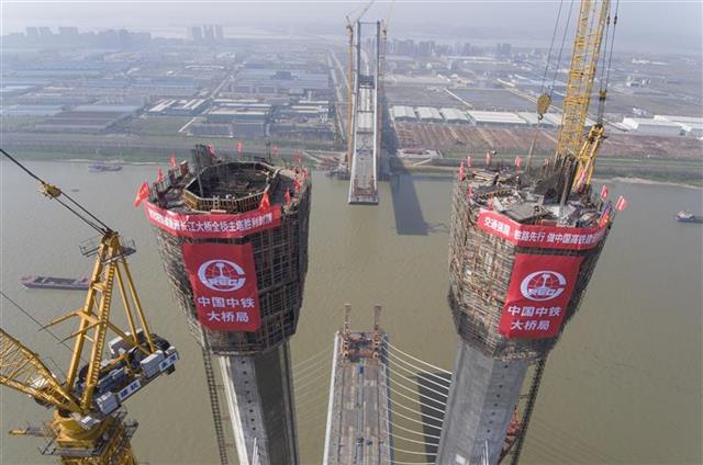 記者看到,安九鐵路鳊魚洲長江大橋位于長江下游河段,與福銀高速公路九江長江二橋相望。爬上橋面,只見兩座H型結構的主塔高聳,其中北主塔高252米,約80余層樓高;南主塔高242米,已于去年12月30日封頂。