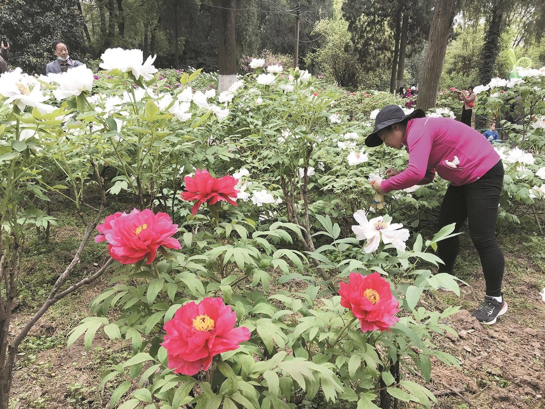武漢植物園牡丹園,兼?zhèn)淙A中地區(qū)牡丹品種選育研究和推廣示范的功能。26日上午,極目新聞記者在現(xiàn)場看到,花匠們正在給牡丹人工授粉,嘗試新的品種選育。
