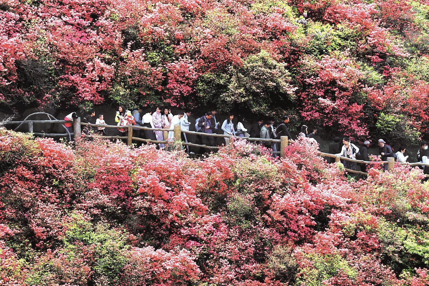 4月4日,武漢市黃陂區(qū)云霧山景區(qū)的杜鵑花次第盛開,迎來最佳賞花期。據(jù)了解,云霧山景區(qū)有杜鵑花4萬余畝,漫山遍野色彩斑斕,蔚為壯觀。