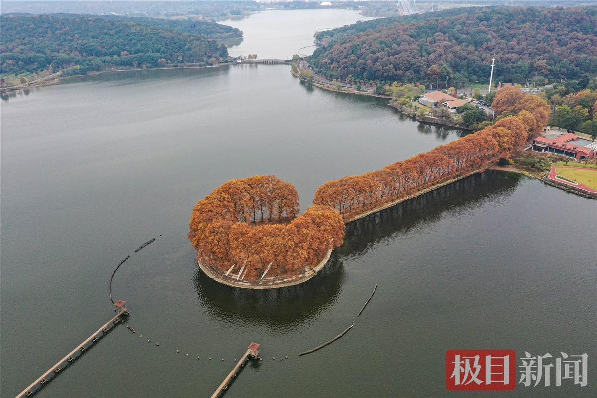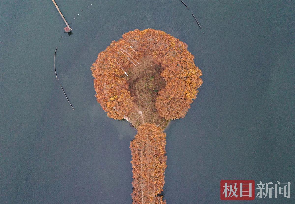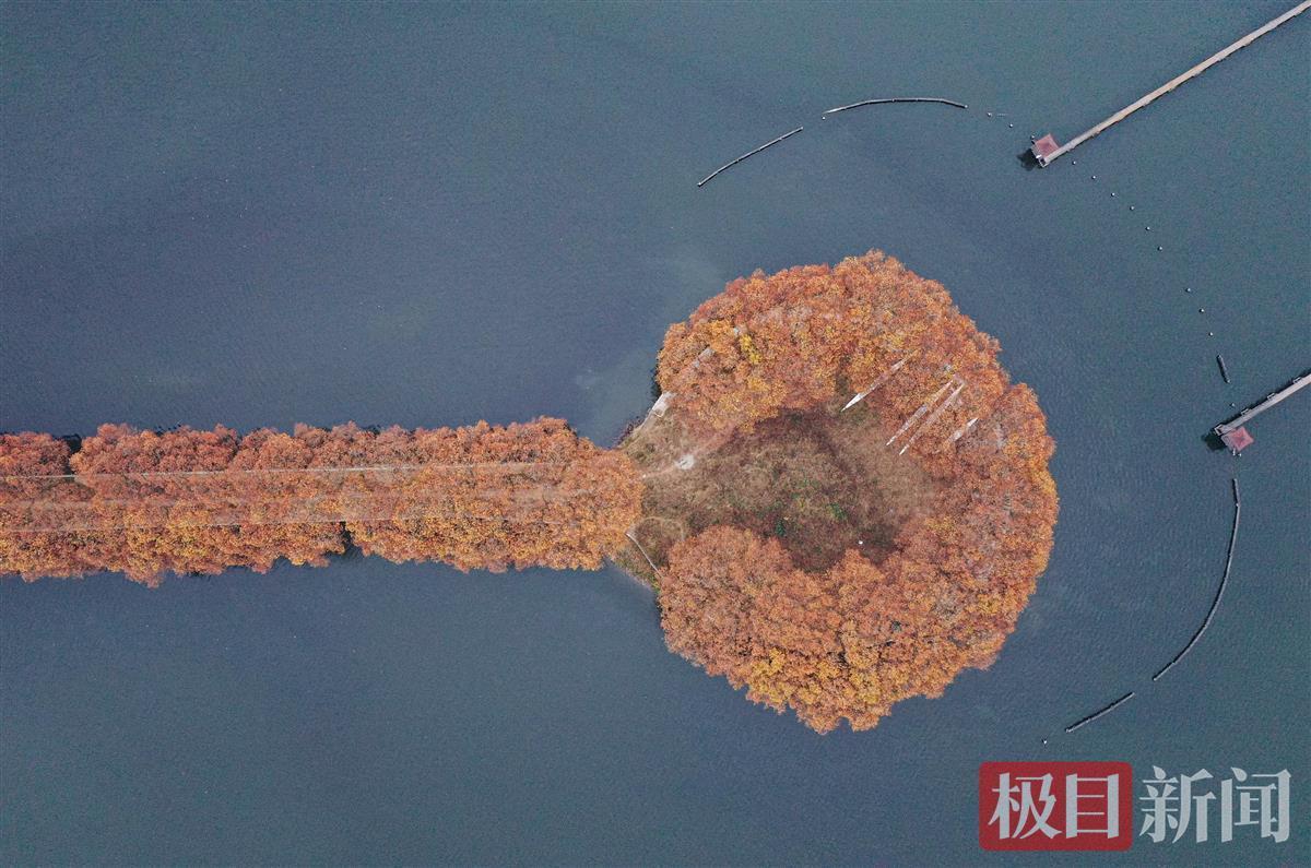 11月20日,極目新聞記者在武漢市東湖南山驛站附近看到,一條橙黃色的法國梧桐,仿佛一個驚嘆號伸入湖中,美不勝收!(極目新聞記者 王永勝 攝)