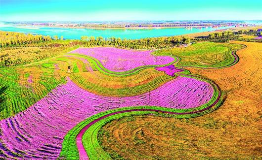 11月10日,花海簇擁下的藍星島生態景觀。位于江陵縣馬家寨鄉的藍星島是由長江泥沙淤積而成的江心洲,總面積5000畝。藍星島將生態優先擺在壓倒性位置,已建成蘆葦公園、七彩花田、花果園、生態牧場等景觀帶,為生態長江再添美景。