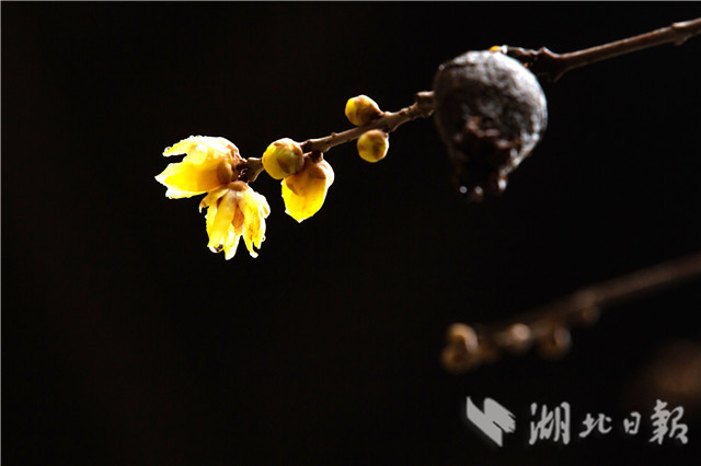 12月26日,在湖北秭歸屈原故里景區屈原祠內拍攝的蠟梅。寒冬時節,蠟梅盛放,花似蜜蠟,馨香肺腑,形成一道冬日溫情風景線。(視界網王罡攝)