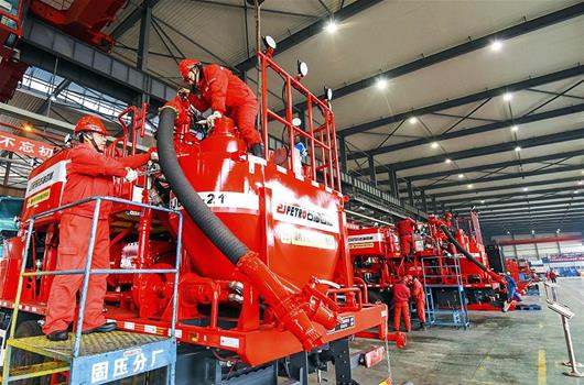 2月11日,位于荊州市的中國石化機械四機公司裝配集成廠,工人正在加緊生產第一季度出口訂單產品。春節期間,該公司科學調配產能、周密安排生產計劃,實現了出口安曼、印度等國的修井機、1300泵撬等油氣開采設備的順利總裝,部分設備已出口發運,實現了新春出口訂單“開門紅”。(視界網 黃志剛 攝)
