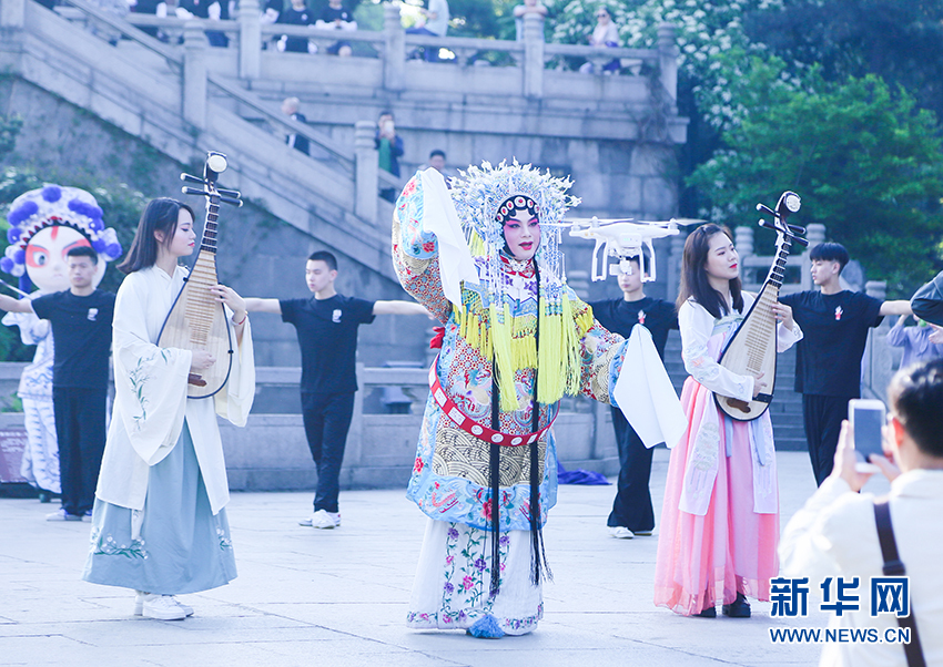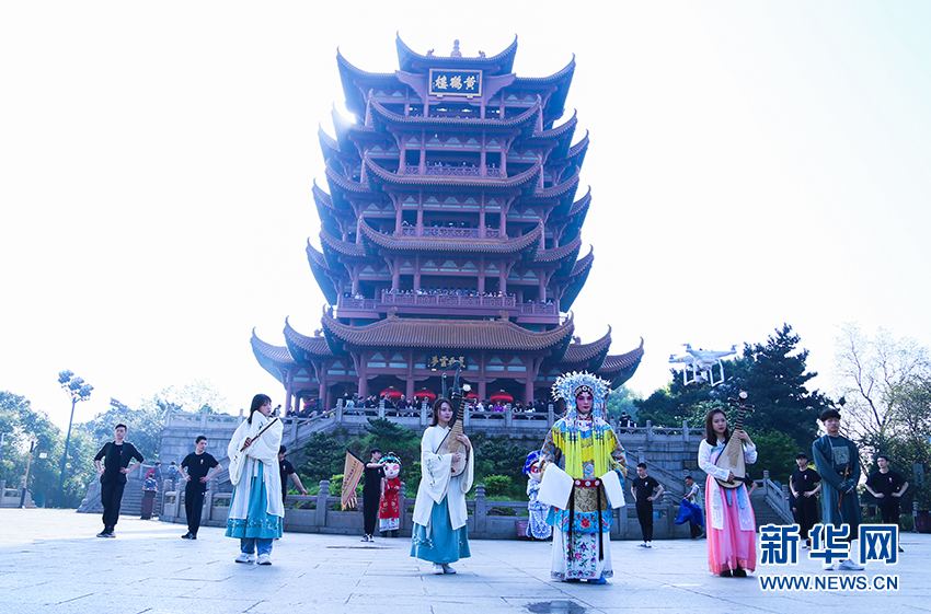 圖為7日在黃鶴樓下舉辦的戲曲快閃活動。新華網(wǎng)連迅 攝