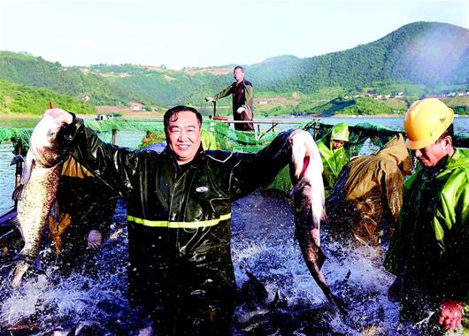 6月3日,保康縣寺坪鎮南河漁業農民專業合作社漁民在收網捕魚。該合作社由112戶村民組成,進行立體生態深水養魚,10多種生態魚深受消費者青睞,暢銷成都、廣州、重慶、南京、北京等城市,社員戶均年增收3萬元以上。近年來,保康縣全面推行河庫長制,大力實行退耕還林、天然林保護等生態修復工程,庫區水環境越來越好,讓當地百姓享受到了“綠水青山就是金山銀山”的紅利。(視界網 陳泉霖 攝)