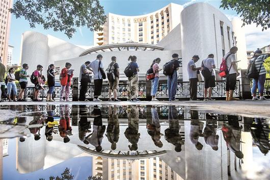 天氣炎熱,湖北省圖書館、武漢市圖書館內閱讀納涼的讀者爆棚,兩家圖書館日均涌入1萬多人。左圖為昨日清晨,讀者早早地在武漢市圖書館外排隊等待開門。楚天都市報記者徐穎蕭顥攝影報道