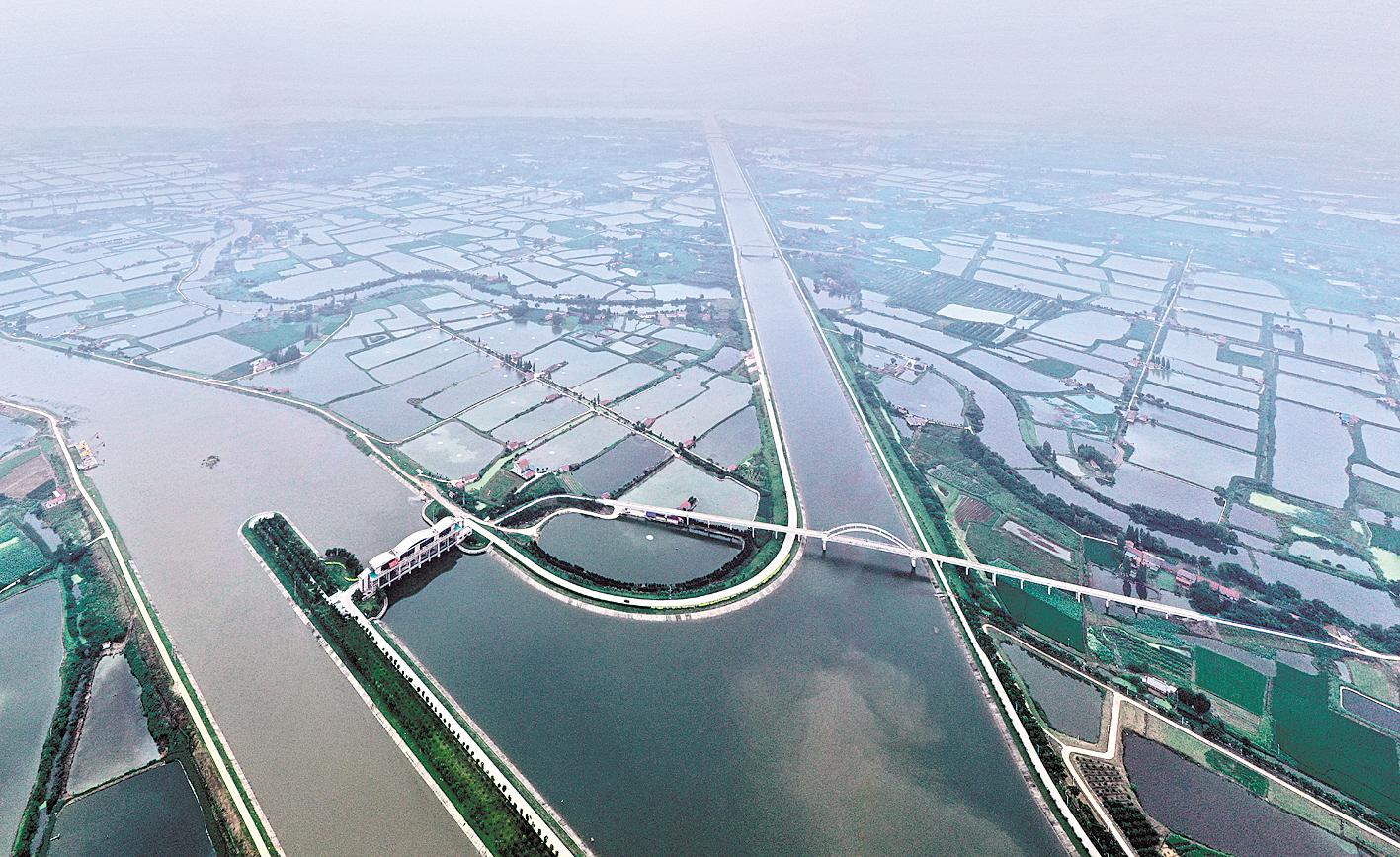 7月14日,為減輕長湖防汛壓力,引江濟漢工程開始為長湖撇洪。圖中河道,左為連接長湖的拾橋河道,右為引江濟漢主干渠。 (湖北日報全媒記者 劉曙松 通訊員 黃志剛 攝)