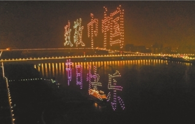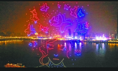 夜空中,千架無人機(jī)編隊(duì)組成“致敬巾幗、節(jié)日快樂”字樣。 記者許巍巍 攝